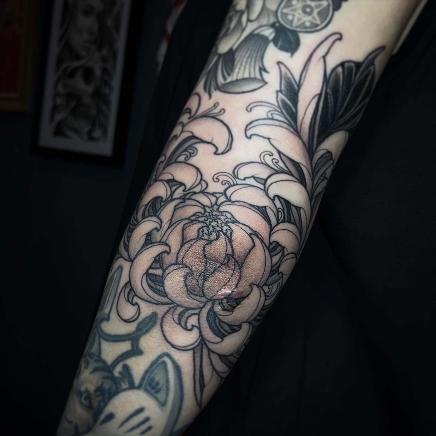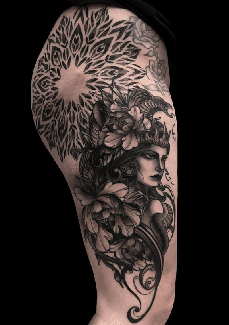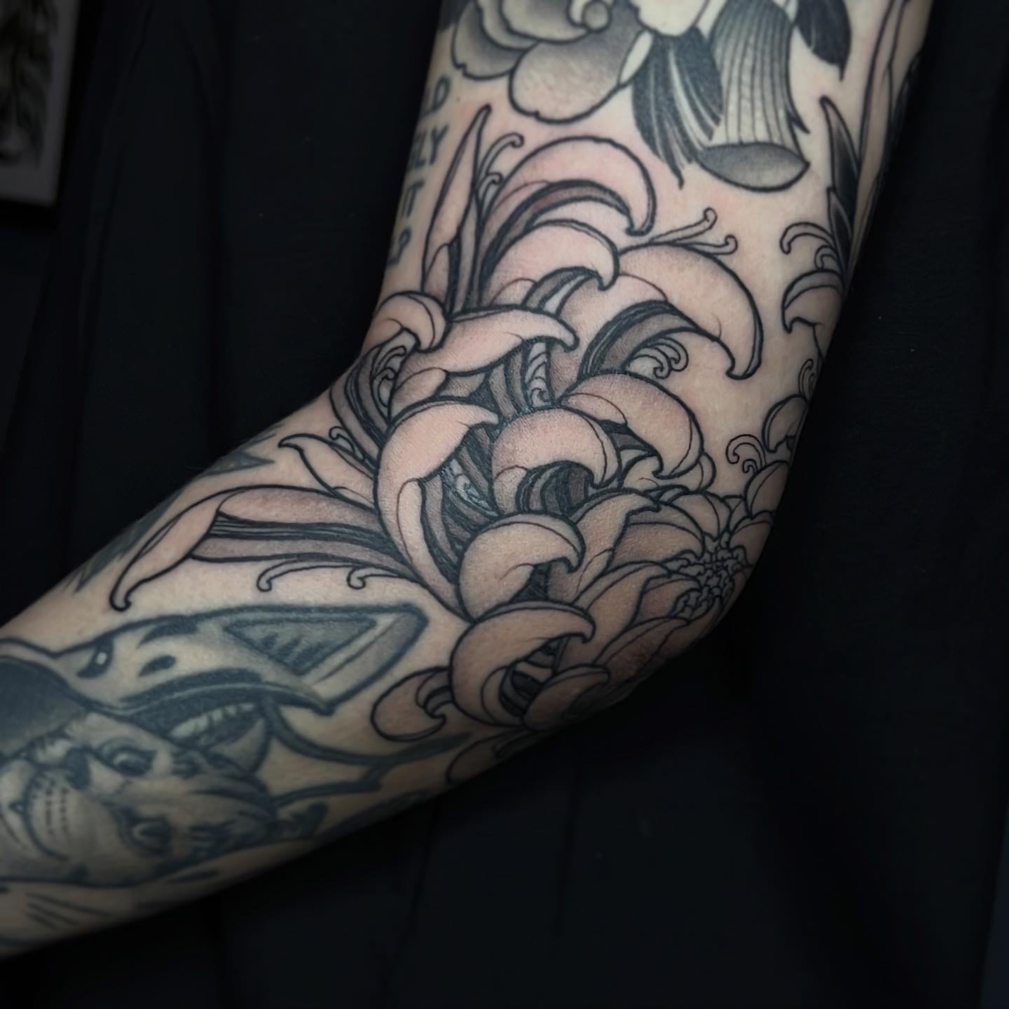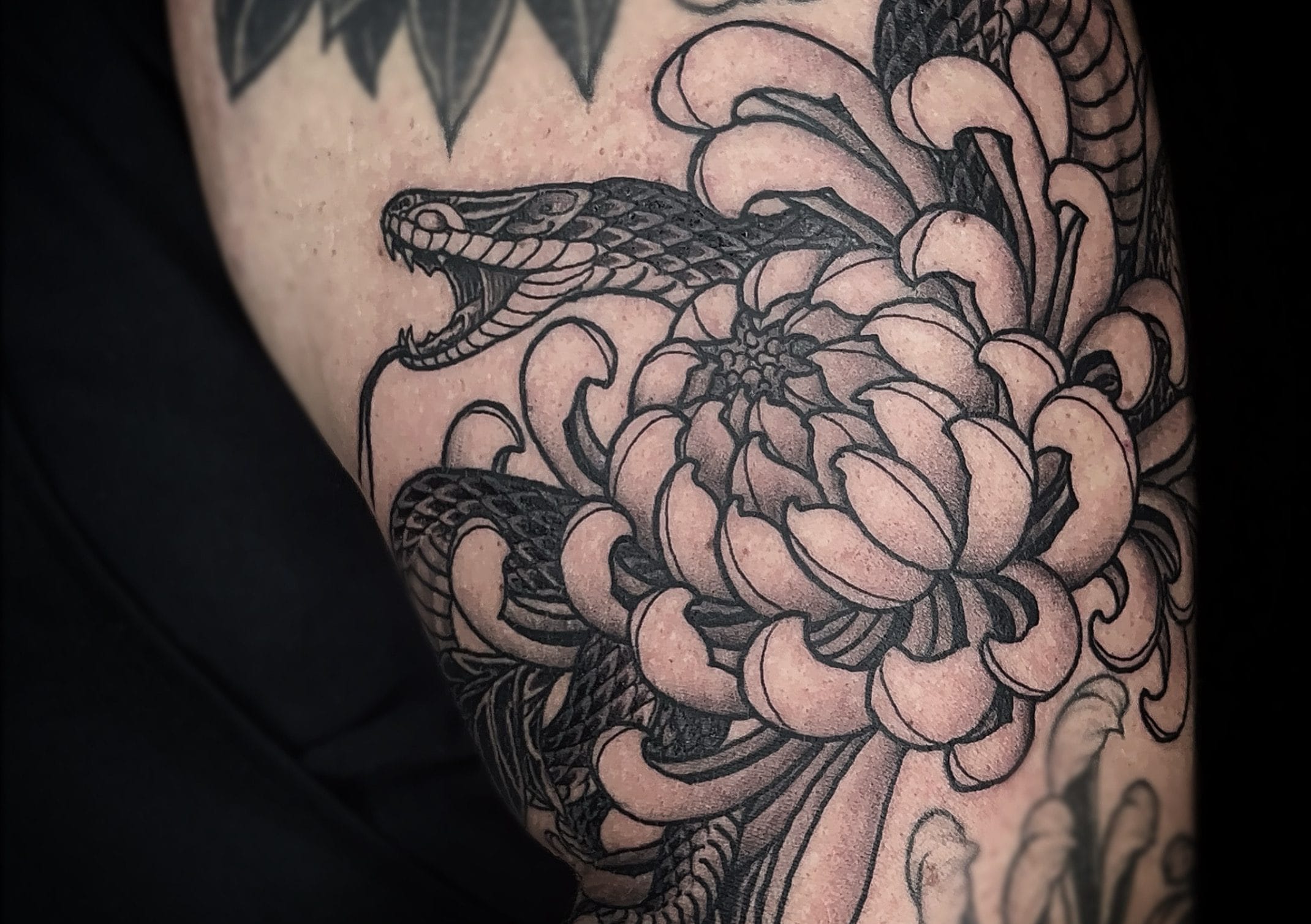 Intricate shading and details create timeless, monochromatic tattoo art with a refined touch.